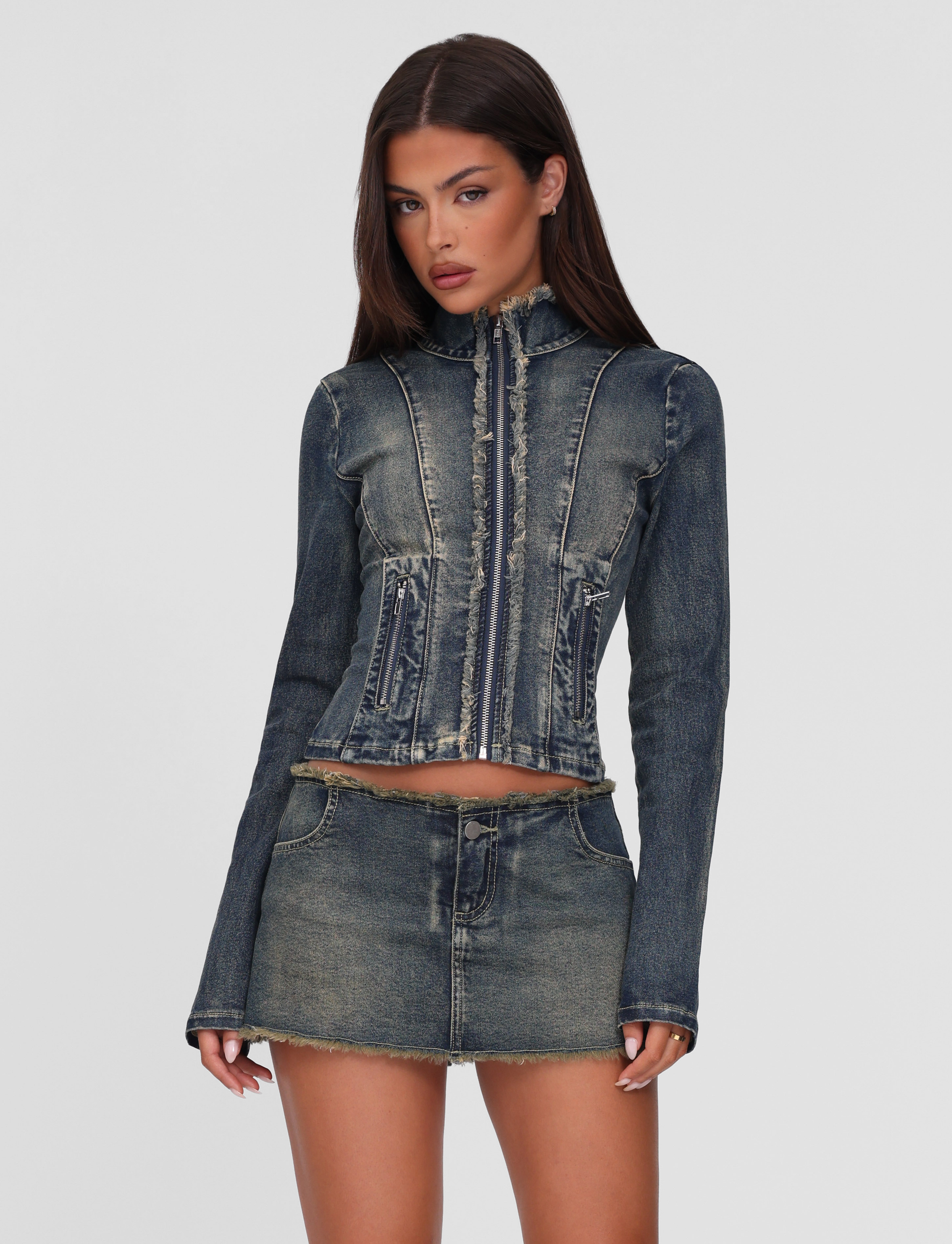 Frayed details at top edge and hem